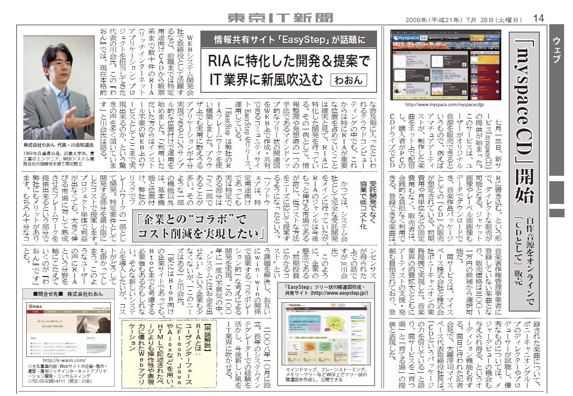 ■ | 2009.07.28 | 「東京IT新聞」120号に掲載いただきました。 |